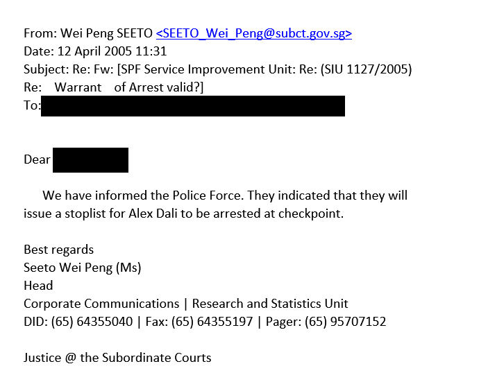 Where things get sticky for Dali — as usual — is that the date range indicated by the certificate is from May 1st 1999 through April 1 2003. According to Singapore national police, the arrest warrant for Dali was issued in September 2003, five months after the dates covered by the Certificate of Clearance. Per this 2005 email from the Sinapore authorities, the arrest was issued September 23, 2003: