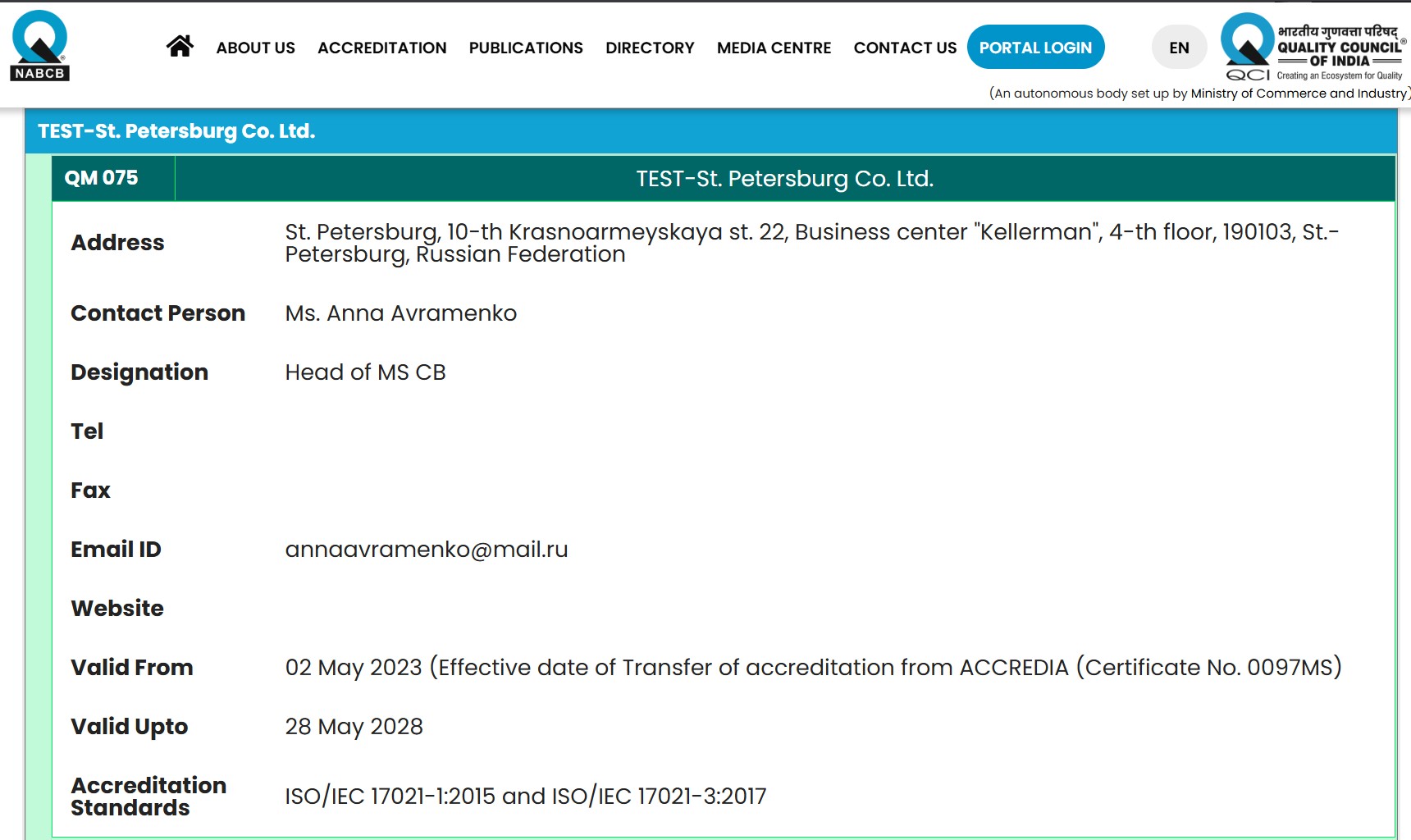 Behind the scenes, however, Riva took steps to avoid his own arrest. Using the time between Oxebridge’s filing and the EC’s acknowledgement, Riva coordinated with the Indian accreditation body, NABCB, to transfer the TEST accreditation to that country. India does not have sanctions against Russia and, silently, in May of 2023, the transfer was complete.
