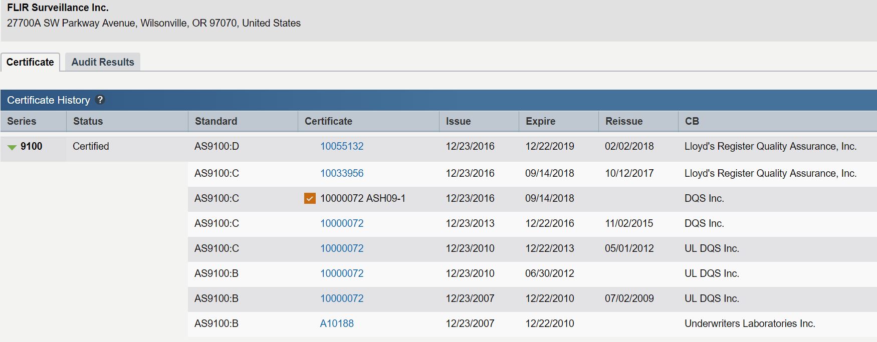Despite this, FLIR Surveillance held AS9100 throughout the entire period, and continues to maintain that certification even after the report was made public. According to IAQG OASIS data, the company was originally certified to AS9100 Revision B by Underwriters Labs (UL) in December of 2007. UL was later purchased by DQS, and FLIR’s certification transitioned accordingly; DQS issued AS9100 Rev C certifications to the company continuously until 2016. At that point, FLIR appears to have switched to the certification body Lloyds Register (LRQA), who issued an AS9100 Revision C certificate in December of 2016, and then updated the company to AS9100 Revision D in February of 2018. The most recent certificate is signed by Chris Koci, President of LRQA Americas.