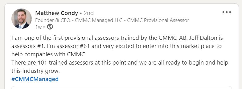 In related news, according to a post on LinkedIn, Dalton granted himself the first CMMC-AB Provisional Assessor credential, despite being responsible for credentialing. Dalton had previously claimed he was working on ensuring compliance to ISO 17011 to address conflicts of interest.