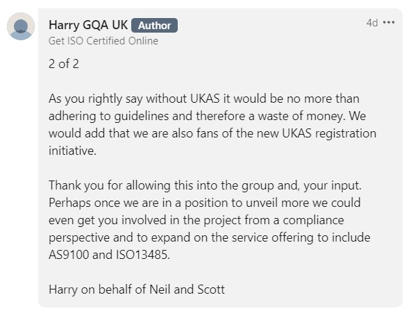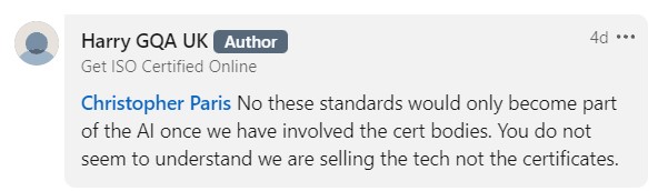 The issue came to light when someone named “Harry” — no last name or verifiable credentials — posted spam on the LinkedIn ISO 9001 Group announcing the program. That resulted in some folks, myself included, calling out “Harry” for promoting a scam. He wasn’t budging, though, and dug in using an even-more-bizarre defense strategy of just denying what appeared in his own post and on GQA’s own website. In trying to muddy the waters and confuse people into buying his £500 / month service, Harry insisted that GQA wasn’t actually selling certificates: