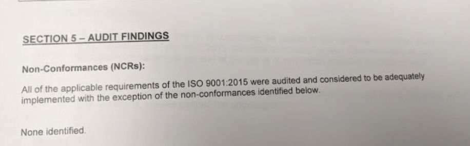 Now, even if you disagree with my parsing of the definition of the term “instant major,” we can all agree when we see blatant report falsification. The final section of the SAI report boldly claimed that “all the applicable requirements of ISO 9001:2015 were audited and considered to be adequately implemented” which was factually untrue and literally impossible.