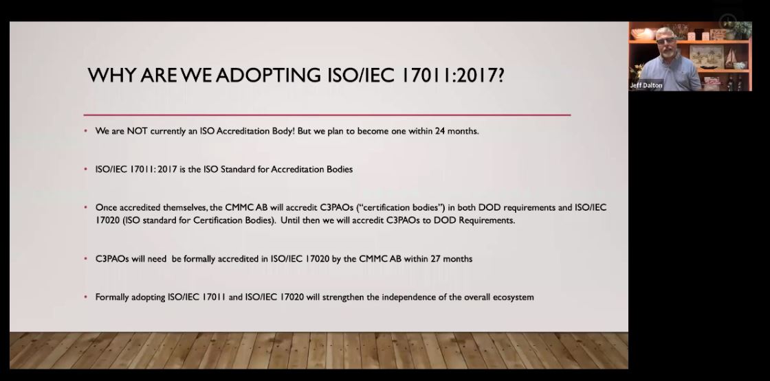 Revealing the scam, they then gave the C3PAOs only three months to implement ISO 17011 after that. This exposes the reality that these ISO 17xxx implementations do not need two years to implement, and the CMMC-AB is only doing this to extend the amount of time they can sell worthless badges. Look at this screenshot from the 23:54 timestamp of a recent CMMC-AB Town Hall: