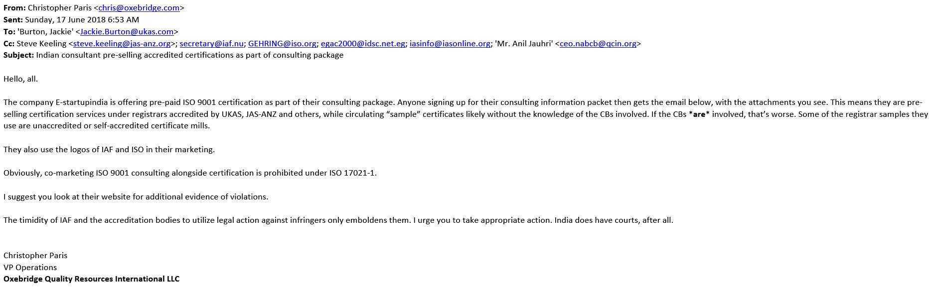 So the whistleblower approached Oxebridge, out of desperation. I then raised the issue with both IAF and NABCB immediately, being sure to identify myself so they could stop this nonsense and get on with the complaint. They just found new reasons to avoid the problem.
