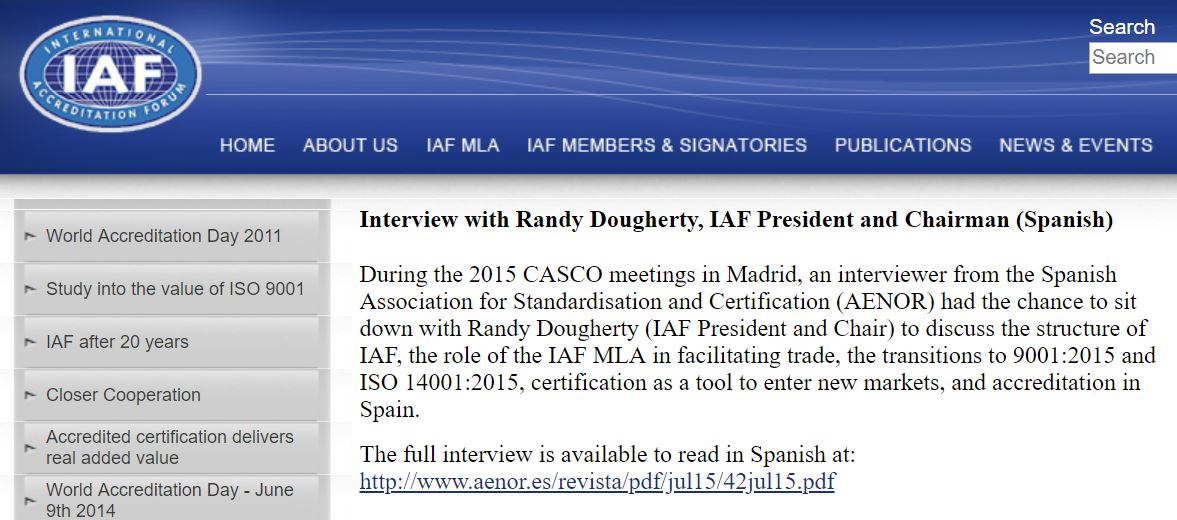 The IAF itself has been mired in conflicts of interest. For many, many years it was largely managed day-to-day by Chairman Randy Dougherty, who was simultaneously a VP from ANAB. If that sounds like a conflict of interest, your hearing is perfect. Dougherty is said to have retired from ANAB (that hasn’t been confirmed), but he still plays a role at IAF. In the past, his roles were clear because they were frequently mentioned in industry press, and there was no attempt to hide his activities; he appeared on panels and committees for the IAF, ANAB, ASQ, CASCO, TC 176, IAAR, ILAC and more, simultaneously yanking out his IAF and ANAB credentials at every turn. There is no single individual on the planet that has had more to do with the ISO certification scheme — and it’s conflicts of interest — than Randy Dougherty. Recently, however, Dougherty began disappearing from both personal appearances and news articles; that this came after a phone call I had with him, in which I told him I was pressing to have the IAF scheme investigated by US regulators. One presumes this timing was a coincidence. One presumes.