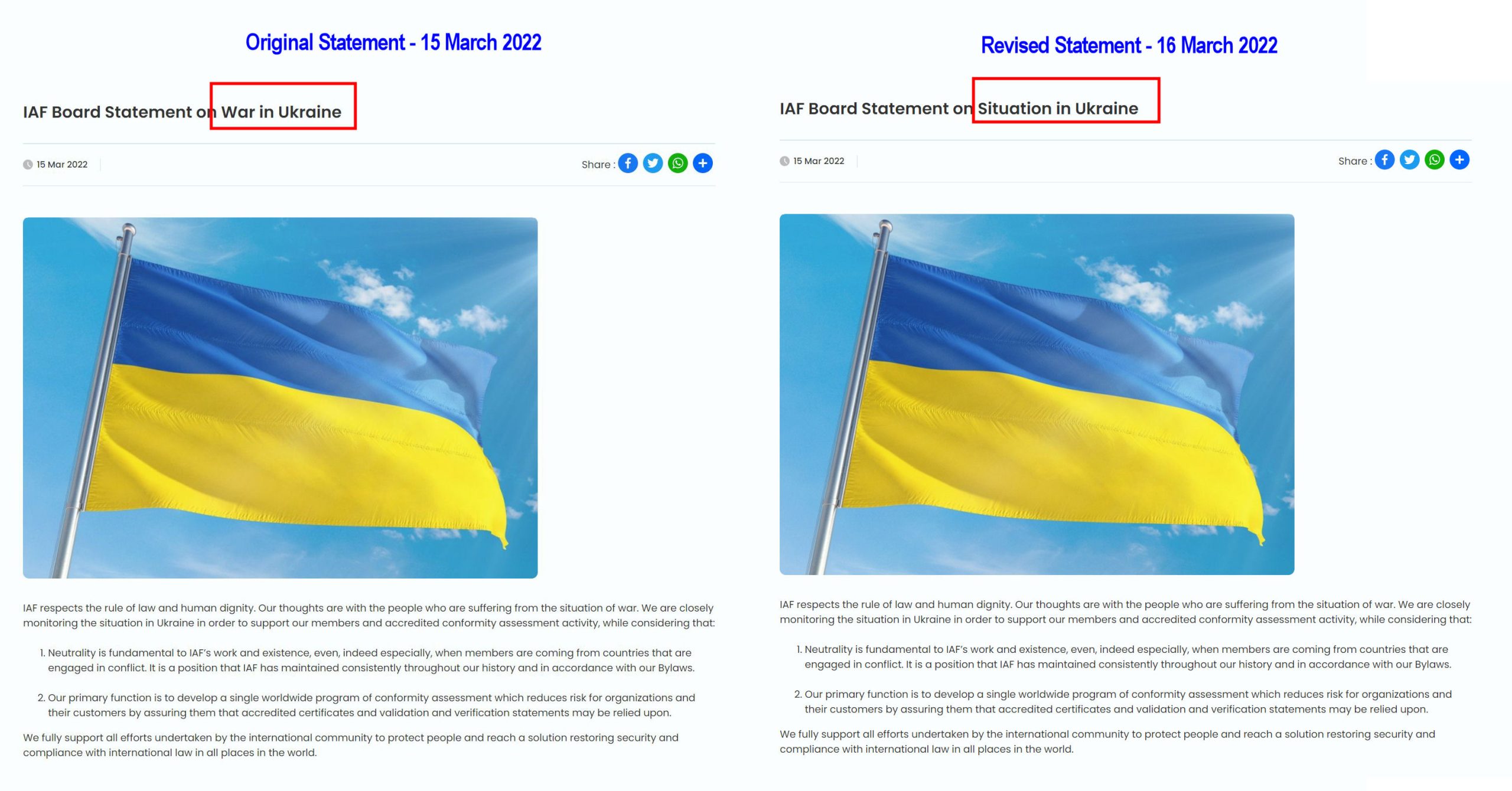 IAF respects the rule of law and human dignity. Our thoughts are with the people who are suffering from the situation of war. We are closely monitoring the situation in Ukraine in order to support our members and accredited conformity assessment activity, while considering that: