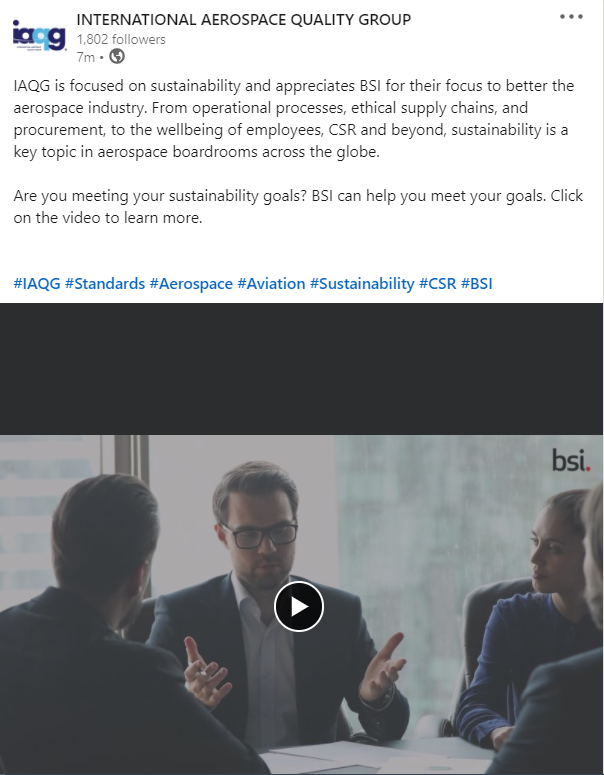 The LinkedIn post included a statement by IAQG openly promoting BSI, saying, “BSI can help you meet your goals,” while ironically discussing “ethical supply chains.”