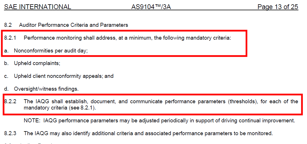 The new version adds section 8.2 on “Auditor Performance Criteria and Parameters” which reads, “Performance monitoring shall address, at a minimum, the following mandatory criteria… (a) nonconformities per audit day.” It then goes on to say that IAQG management will “establish, document, and communicate performance parameters (thresholds), for each of the mandatory criteria.”