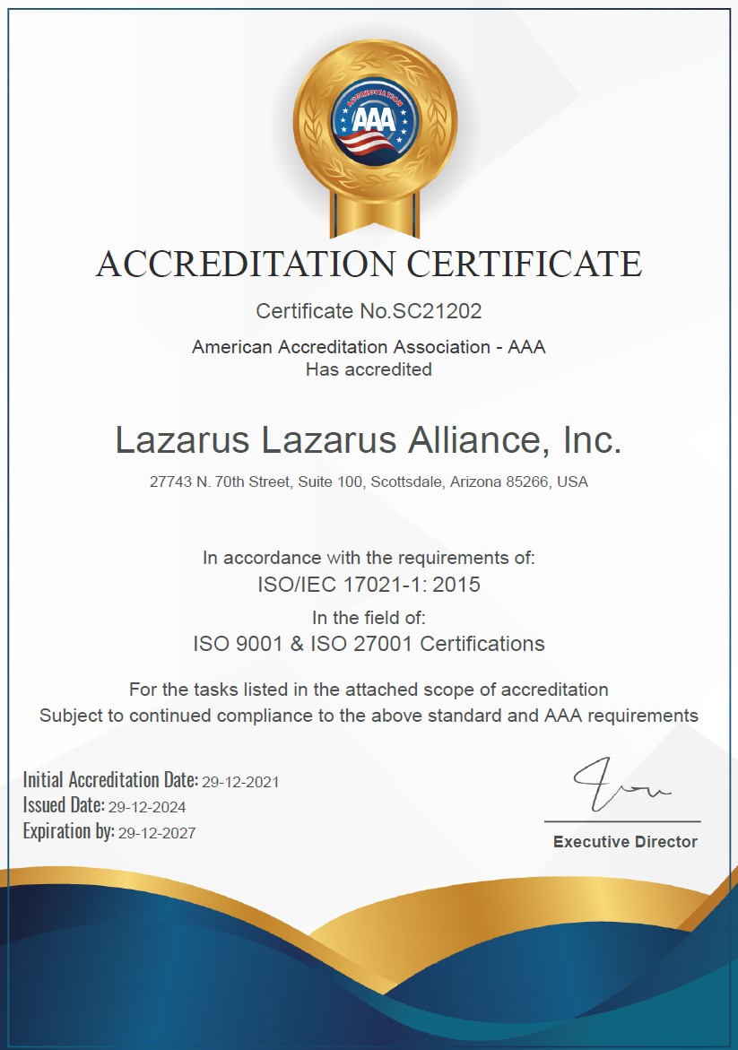 Oxebridge then discovered that Lazarus holds a non-IAF accreditation from the “American Accreditation Association,” an Egyptian-run accreditation mill operating out of a Virginia office spaceThat certificate — which appears to include a typo in Lazarus’ name —  grants Lazarus the right to operate as an official ISO 9001 and ISO 27001 certification body. Since the AAA is not an IAF signatory, any 9001 or 27001 certificates issued by Lazarus would not be recognized nor entered into the official IAF CertSearch database used by Federal agencies. It could be, however, that Lazarus was duped by AAA and was unaware of IAF signatory expectations of CBs. Nevertheless, it raises questions about Lazarus’ knowledge of accreditation scheme ethics and expectations.