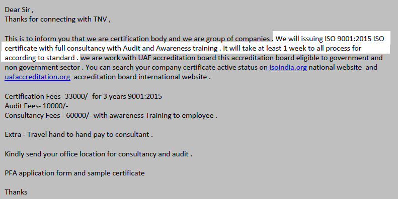 TNV email proposal for ISO 9001 offering “certificate with full consultancy.”