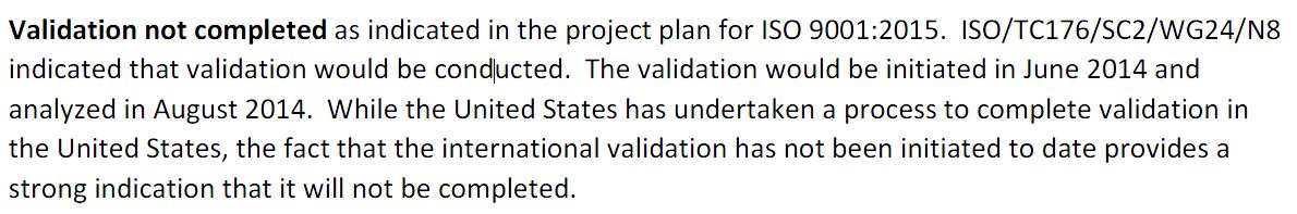 Next, the US has been concerned that the validation stage was not properly adhered to. This too was overruled by TC 176; to prove this, we need only go back to the last official voting guidance document (also attributed to Lorri Hunt) which was used to direct the members on how to vote for the DIS, back in September of 2014: