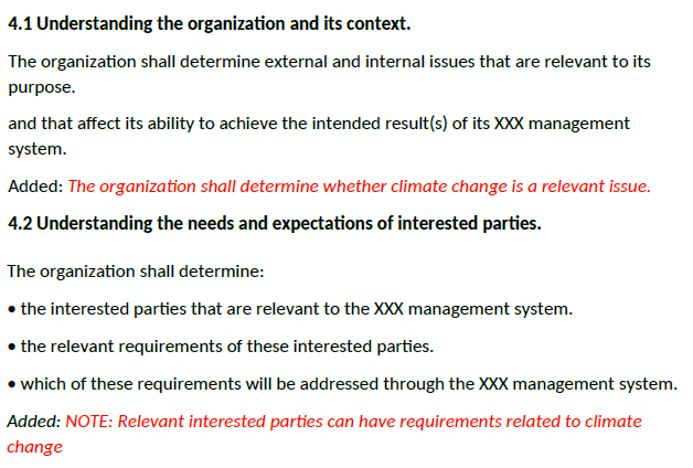 The language to be added is shown below and affects current clauses 4.1 and 4.2 of ISO 9001. In both cases, the language can largely be ignored by users, since it only suggests the user consider climate change, and does not require any documentation or records of the decision.