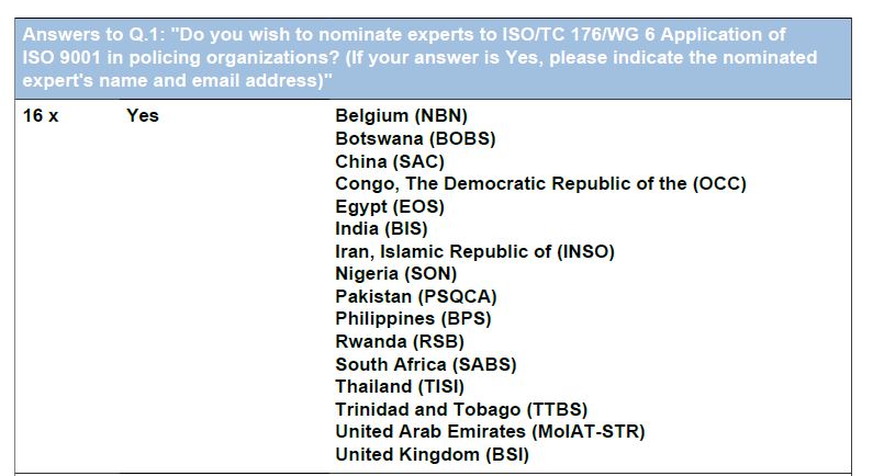 The revelation, published in official ISO document N1391, shows that an overwhelming number of ISO member nations declined to participate in the project, refusing to provide national experts. Of a total of 84 member nations who voted, only 16 agreed to provide subject matter experts. This was not a vote on approval of the work project, which has already been approved, but instead only a vote as to whether to send experts to participate; nevertheless, the lopsided results show the idea of creating a “policing” standard is not universally accepted.