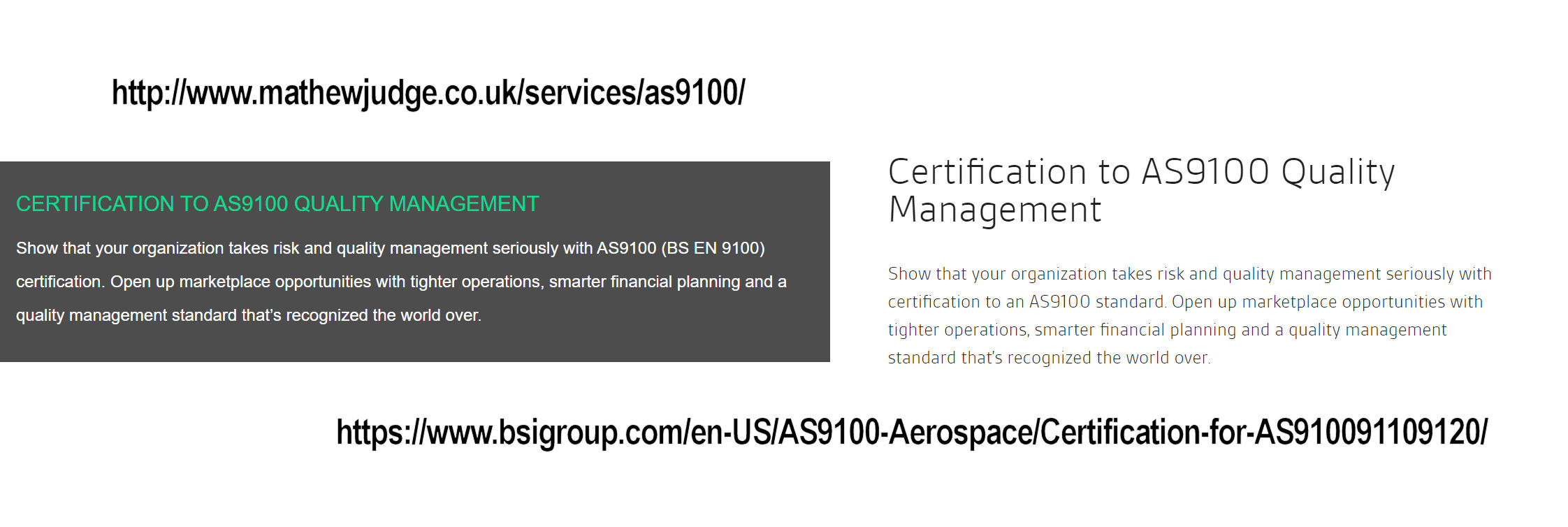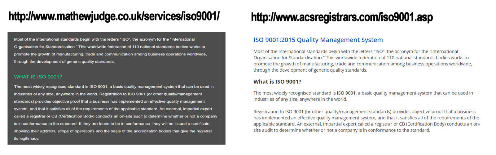 Making matters worse, Judge’s website appears to be comprised almost entirely of material plagiarized from multiple other sources, including ISO registrars, competing consultants and at least one US author. His entire page describing ISO 9001 includes text which also appears on the website for the accredited certification body ACS Registrars: