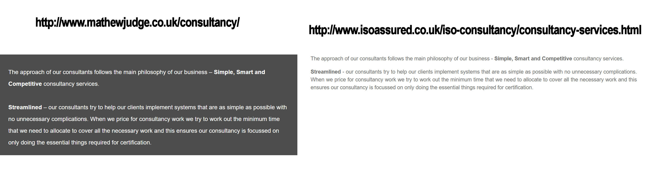 Judge’s page on “Consultancy” contains the exact text appearing on a 2013 website for the consulting firm ISOAssured UK.