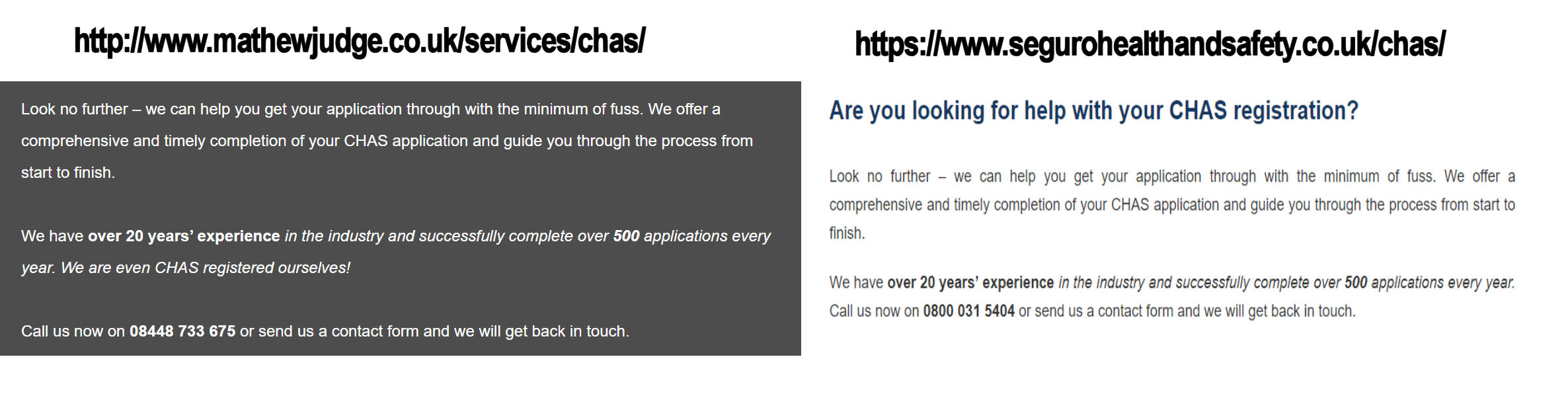 Judge’s page on CHAS accreditation appears to have been taken from the website of the consulting firm Seguro, and even includes the phone number for Seguro, rather than that of Judge. Even the number of clients Judge claims to have (“500 applications every year“) was plagiarized from the Seguro site.