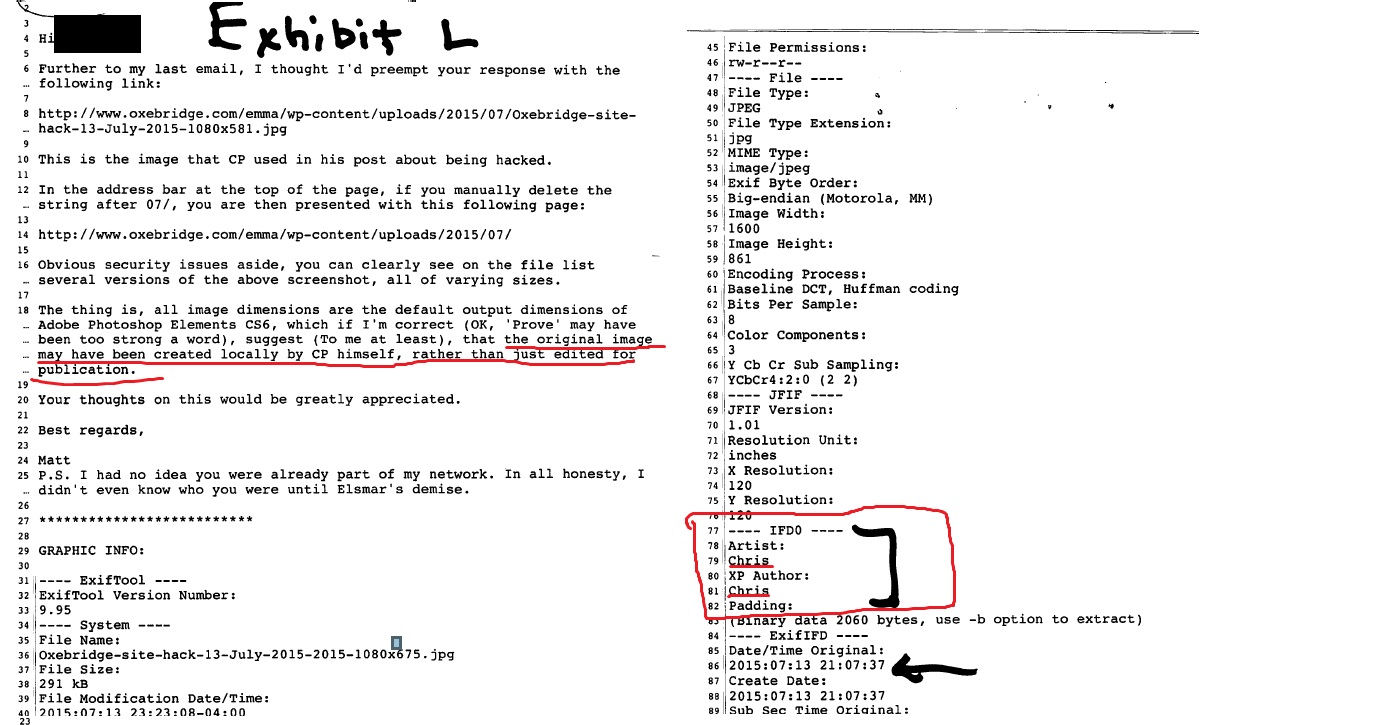 As deconstructed here, Judge claimed Oxebridge hacked its own website, citing as evidence the metadata of an image he pulled from the Oxebridge site. The image he analyzed was not those created by the hacker, but a screenshot taken later by Oxebridge as evidence of the hack. While Judge claimed the metadata “proved” Oxebridge hacked its own site, he immediately backed off that claim, saying, “prove may be too strong a word.”