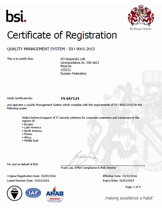 Quick hit: Kaspersky Labs, the antivirus software developer being investigated for using their software as a spying platform for the Russian intelligence agencies, is certified to ISO 9001 by BSI. Their certificate includes, of course, the logos of ANAB and IAF.