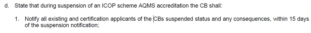 … during suspension of an ICOP scheme AQMS accreditation the CB shall (1) Notify all existing and certification applicants of the CBs suspended status and any consequences, within 15 days of the suspension notification.