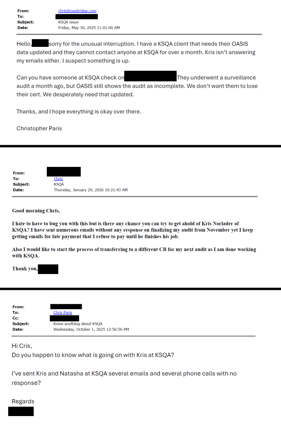 For a while, I had been recommending KSQA, but had to withdraw that recommendation after multiple clients reported that their staff, led by former Dekra auditor Kris Norlander, were not answering emails, responding to phone calls, uploading reports to OASIS, or processing NCs on time. It had become a joke: the clients would write to me, I would text Norlander, and then he would reply to the client. Maybe. Sometimes.