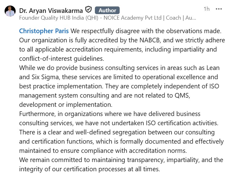 There’s a whole lot to unpack in that comment. First, notice how he pluralizes himself (“we“), which suggests he’s either French, pregnant, or has a mouse in his pocket. But then see how he invokes NABCB accreditation — as if that ensures any trust at all — and then claims that his consulting is “not related to QMS development or implementation.”