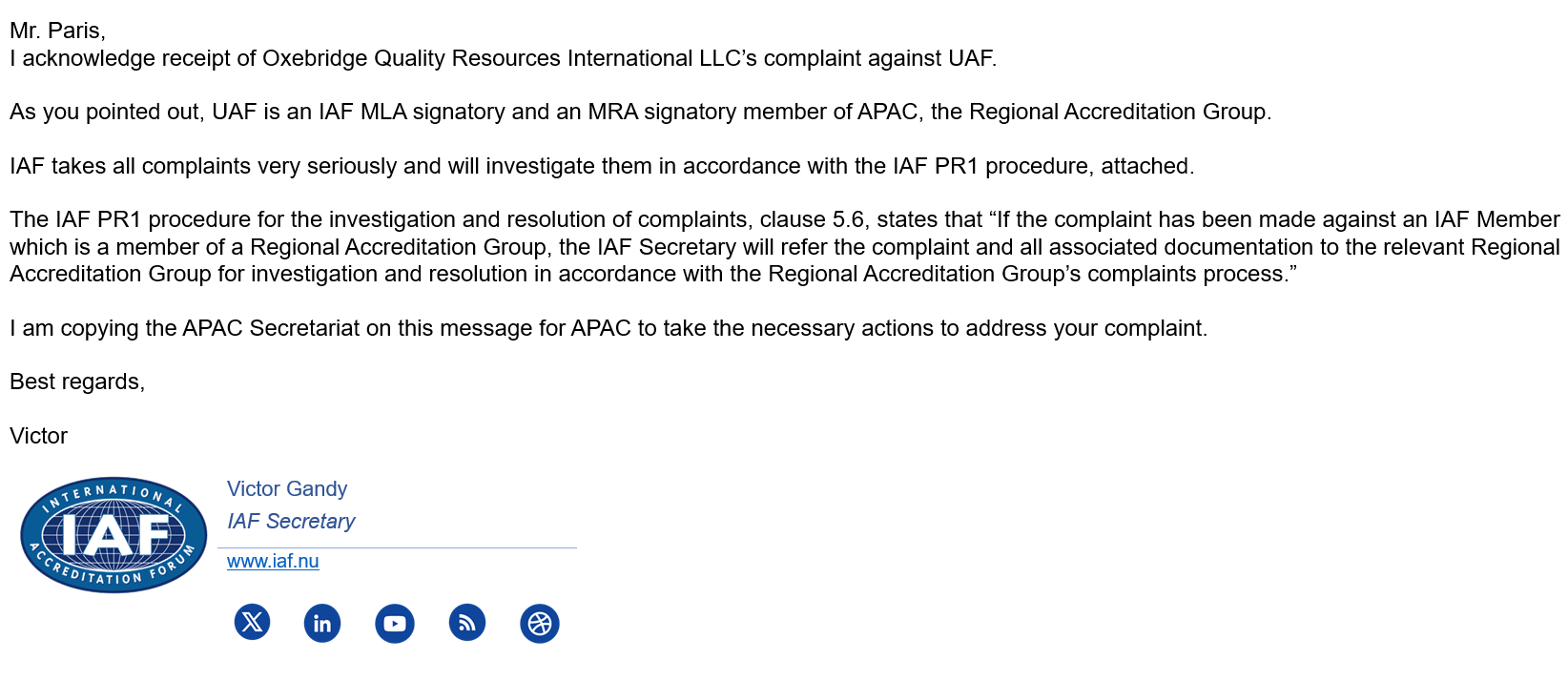 I used to say it was metaphorically criminal that the IAF allows APAC to get away with granting membership to bodies that everyone else on the planet has rejected. I may be ready to go further and say it is literally criminal. APAC is claiming to do ISO 17011 peer evaluations to members. That cannot be possible in UAF’s case. There is no way that UAF is anywhere near compliant to 170911, and yet Drake ignores it. This appears to me to be overt fraud.