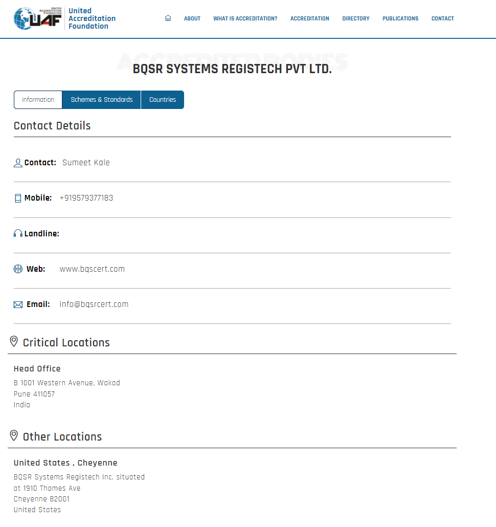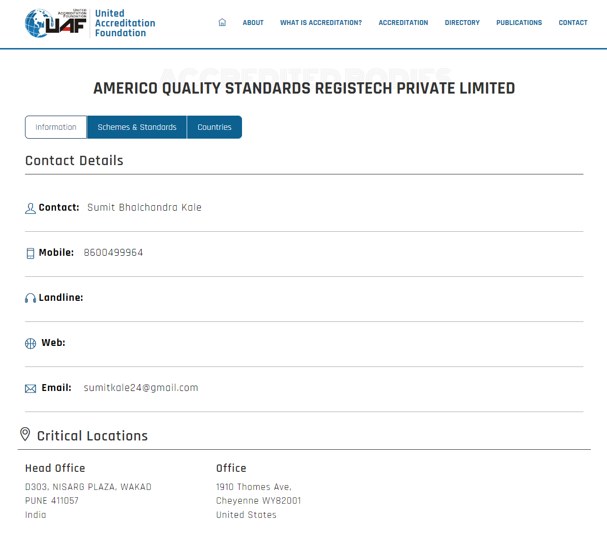 So Kale immediately started issuing fake certificates under BQSR, but now they are with the UAF logo. Not stopping there, Kale also got another one of his fake certificate mills, Americo Quality Systems Registech (or something like that), accredited by UAF. But to do that, he had to use an alternate spelling of his name to make it appear he was totally a different person. The UAF and Sadana ignored that part since Kale paid them off, too.
