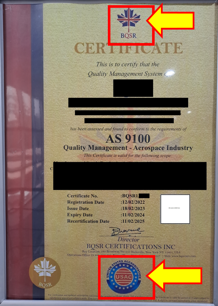 Here is one of Kale’s fake AS9100 certs, issued under an alternate (and equally fake) accreditation body, “USAC”:
