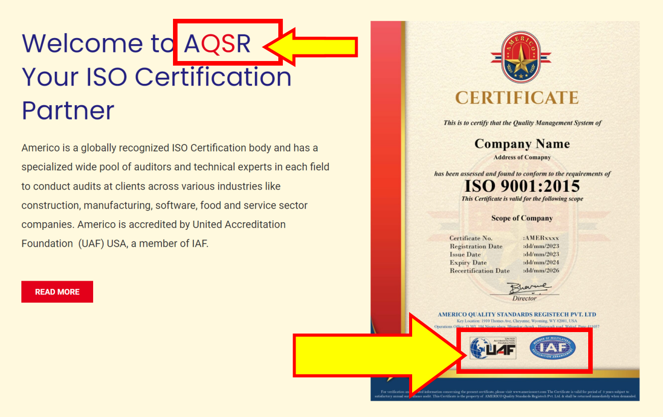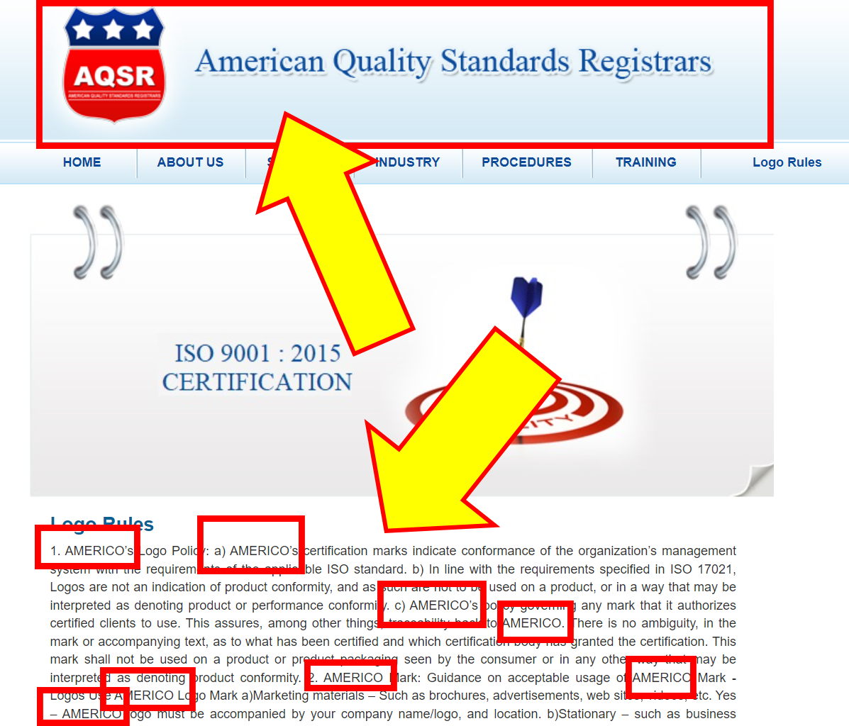 Meanwhile, it gets even more complicated as Kale pumps out fake companies and websites like snakes take shits. He runs another fake mill, also called “AQSR,” but bearing the name “American Quality Standards Registrar” in the website logo. The metadata for the site uses the name “Americo,” though, as does their official “procedures” page.