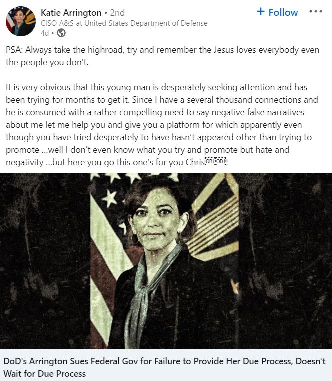 Arrington is aware of the formal complaints filed against her, but nevertheless repeatedly targeted Paris for personal attacks on LinkedIn. Ironically, Arrington hired famed whistleblower protection attorney Mark S. Zaid, who now finds himself representing a client accused of whistleblower reprisals.