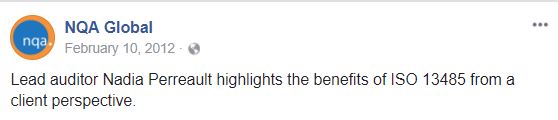 - Nadia Perreault – another Associate Consultant, NQA didn’t mind trotting her out for this Facebook post which boasted of her being a Lead Auditor for NQA under the ISO 13485 medical device scheme. Perrault was listed with the Greenwich Consulting Group a few years back, but it’s not clear if that consultancy is still in operation.