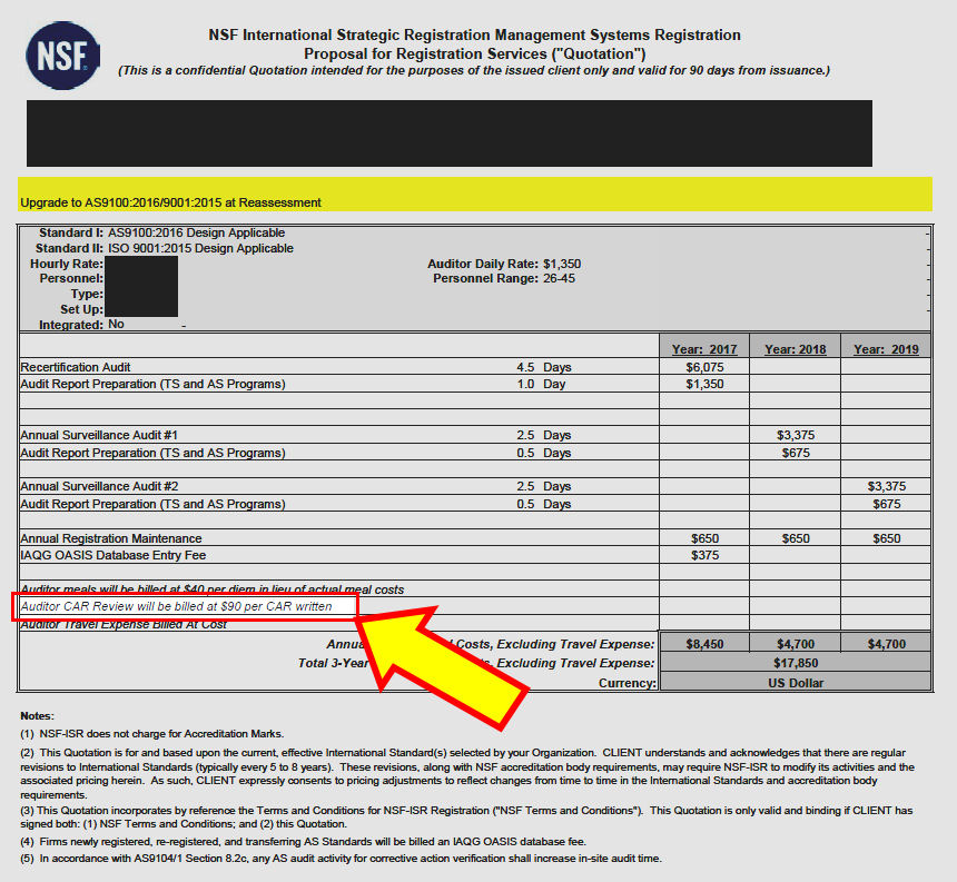 In a practice that appears to go back as far as 2016, the ISO 9001 and AS9100 certification body (CB) NSF-ISR has included language in its quotes and contracts which give the registrar the right to charge $90 for each audit “CAR” (corrective action request) filed. The practice had been attempted by registrars in the earliest days of ISO 9001 certification, and roundly criticized as a means of monetizing findings, and creating an artificial incentive for CB auditors to write bogus findings. It was thought that the practice was dropped entirely.