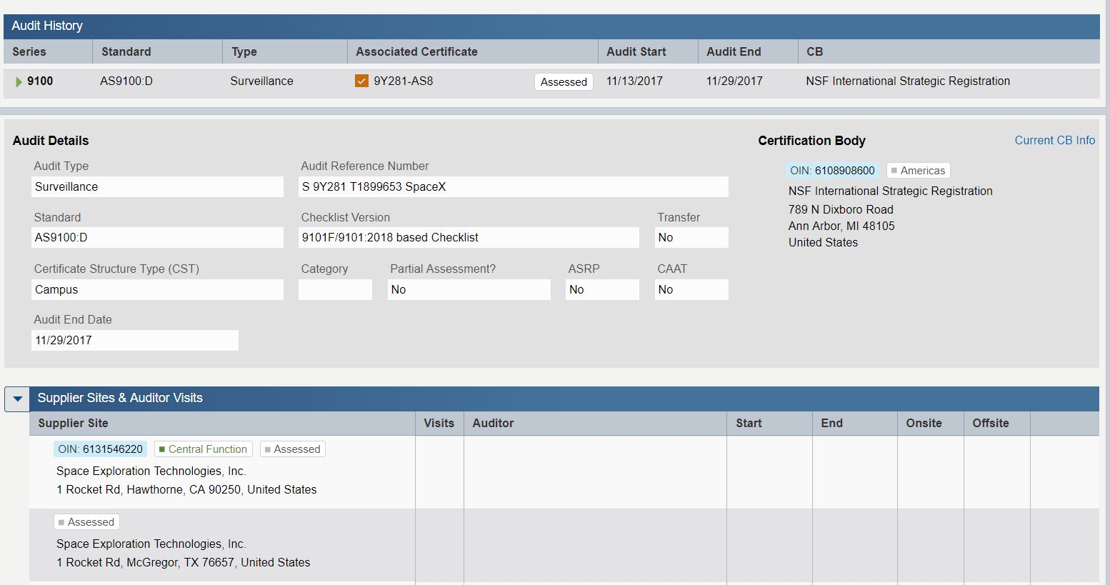 Ironically, NSF-ISR is on the receiving end of criticism for not writing audit nonconformities, even when they are known to them. The US Dept. of Defense’s Inspector General reported that it found 75 AS9100 nonconformities at SpaceX, of which 33 were classified as “Major,” and yet SpaceX held an AS9100 certificate from NSF-ISR at the time of the DoD audit. The audit was conducted between June of 2015 and March of 2016, and then published in December of 2017. SpaceX’s last NSF-ISR audit was, according to OASIS data, in November of 2017, and resulted in NSF-ISR continuing to award SpaceX with an AS9100 certificate. While it was likely NSF-ISR was not aware of the DoD’s findings, since the final report had not yet been published, NSF-ISR nevertheless failed to independently notice any of the 75 nonconformities found by DoD. Furthermore, despite the widespread publication of the DoD report since, and the detailed listing of AS9100 nonconformities, OASIS records show no special audit launched by NSF-ISR nor mandated by ANAB to investigate the nonconformities, and SpaceX’s accredited certification has been maintained without any interruption. This should not be possible under the accredited AS9100 scheme.