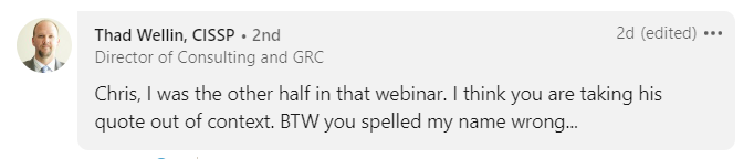 Pro tip: calling out conflicts of interest to improve the trust of CMMC certifications is not being a “naysayer of the CMMC program.” It’s being a naysayer against the possibility of corruption. Maybe the CMMC-AB should get on board with that, instead of taking swipes at those of us trying to fix this mess.