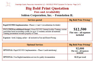 Tampa FL — Oxebridge Quality Resources International is happy to introduce an even more streamlined method of quoting costs for its ISO 9001 and other services. “Big Bold Print Quoting” presents a flat, fixed rate cost in easy-to-understand terms.