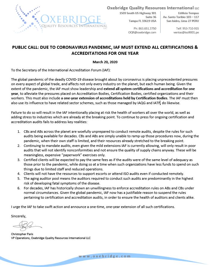 Oxebridge Quality Resources International is requesting the International Accreditation Forum (IAF) automatically extend all the certifications and accreditations under its oversight for one year, to allow the coronavirus global pandemic to subside. Oxebridge is asking the IAF to use its influence to then extend to industry certifications such as AS9100 for aerospace, and IATF 16949 for automotive manufacturers.