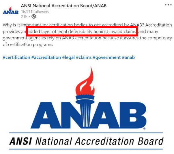 ANAB went further and repeatedly marketed its accreditation as a tool companies can use in court to provide “an added layer of legal defensibility against invalid claims.”
