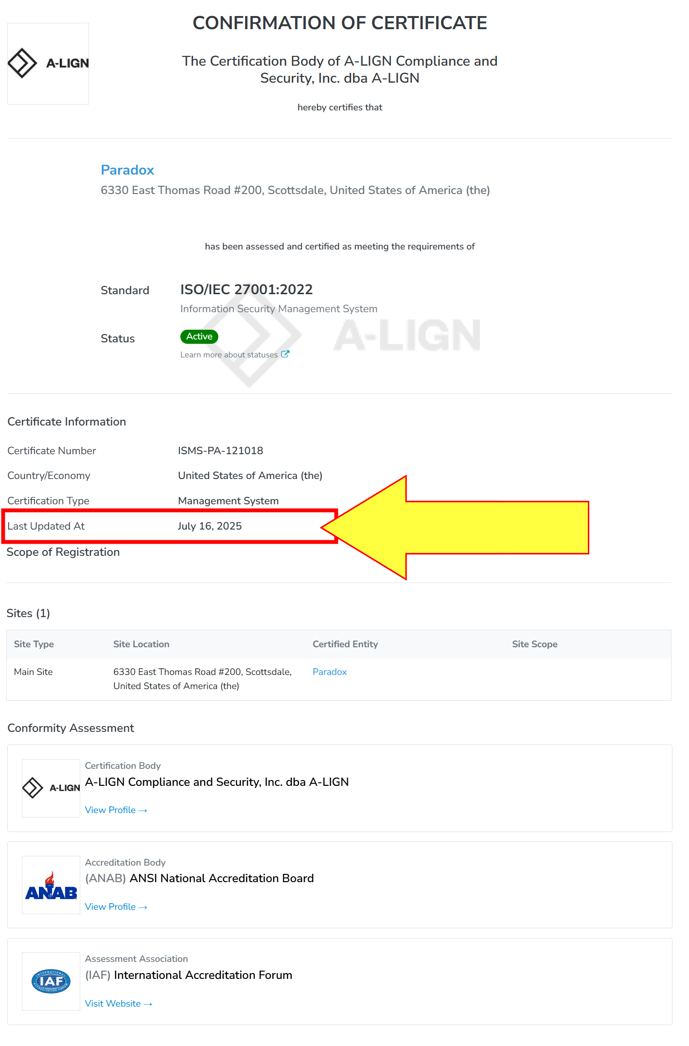Meanwhile, Paradox has held both ISO 27001 and SOC 2 security certifications since 2019, according to the company’s press releasesThese certifications were issued by A-LIGN, which is then accredited by ANAB in the United States.
