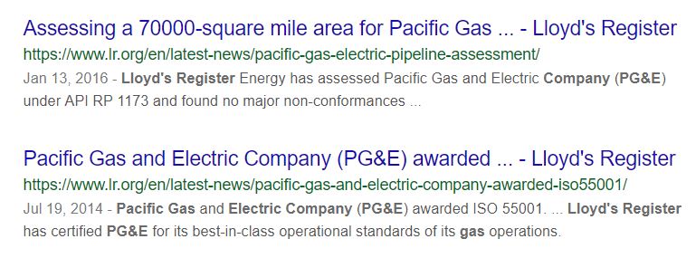 While press releases touting the certifications remain on the PG&E website, the LR website has since been scrubbed of all references related to PG&E, according to Google search results. In at least one of these, LR previously boasted that PG&E exhibited “best in class operational standards [for] its gas operations.” One of these results shows the now-deleted reference to PG&E’s API RP 1173 certification.