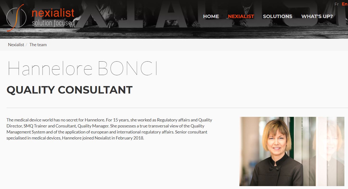 In any other industry, Ms. Font would be a pariah and never allowed to go near a product again, never mind as an “expert.” Not so in the ISO standards profession, of course, where she now finds herself operating a private consultancy and being featured as a staff consultant for the French firm Nexialist, a medical device consulting firm. Without a shred of irony, the Nexialist site quotes its ability to help companies adhere to regulations and ISO standards, all while hiring a staffer who literally was arrested for not doing any of that: