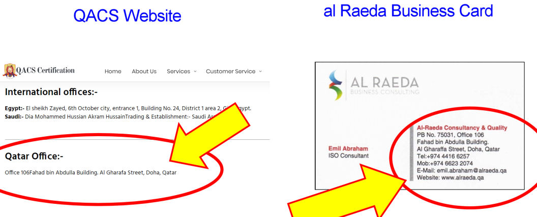 Agrawal then denied any relationship between QACS and al Raeda, demanding additional evidence. Oxebridge complied, pointing to multiple online business listings which show the street address for QACS and al Raeda to be the same, as well as the posting of an online business card by a consultant of al Raeda which bears the street address appearing on the QACS website.