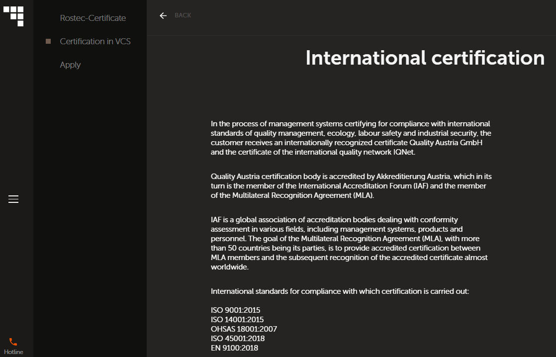 RT Tech Priemka then, itself, issues ISO 9001 certificates under the name Rostec-Certificate. The company claims self-accreditation, publishing an official-looking accreditation certificate which is signed under the authority of itself. The Rostec-Certificate and RT Priemka share the same website at rttec.ru.