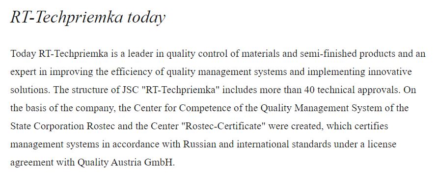 On the same page describing its ownership by Rostec, RT Tech Priemka boasts its relationship with Quality Austria, claiming it issues ISO 9001 certificates under a “license agreement with Quality Austria GmbH”: