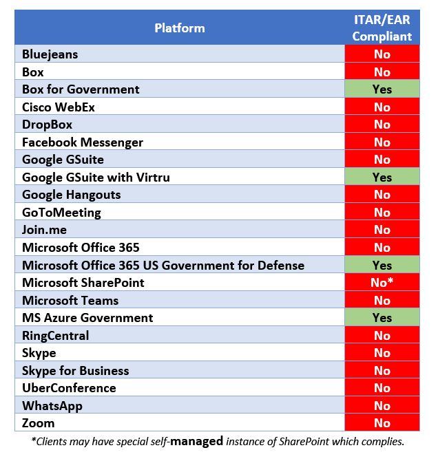 Bluejeans has been deemed as not allowable for ITAR/EAR data transmission by the University of Michigan. U-M also researched and claims that Google Drive cannot be used for ITAR information, and repeats that the same restrictions apply to MS Office, OneDrive, and Zoom, among others.