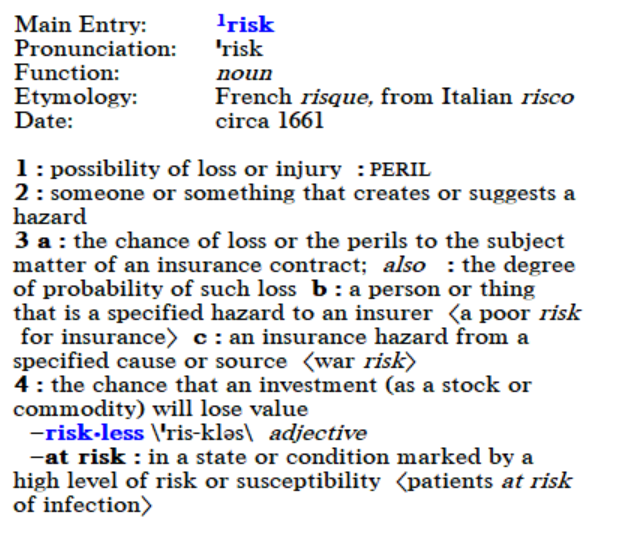 In checking the other “definitions” provided in Dr. Ardebili’s Table 1, I found none of them were accurate. He attributes the definition “risk is a probable frequency and probable magnitude of future loss” to the 11th edition (2004) of Merriam Webster’s Collegiate Dictionary. That dictionary, however, defines risk as follows: