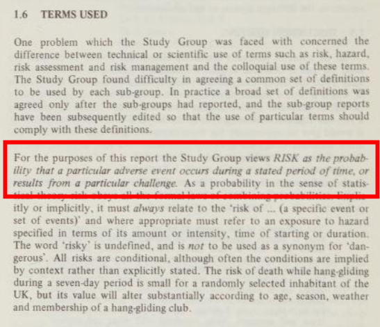 Even the text arguing that risk is negative appears incorrectly cited. The text “the study group views risk as the probability that a particular adverse event occurs during a stated period of time” is attributed to a 2011 publication titled Risk Management: The Open Group Guide, edited by Jim Hietala and Ian Dobson, which does not appear to include that quote at all. Instead, it originally appeared in “Risk Assessment: Report of a Royal Society Study Group,” published in 1983.