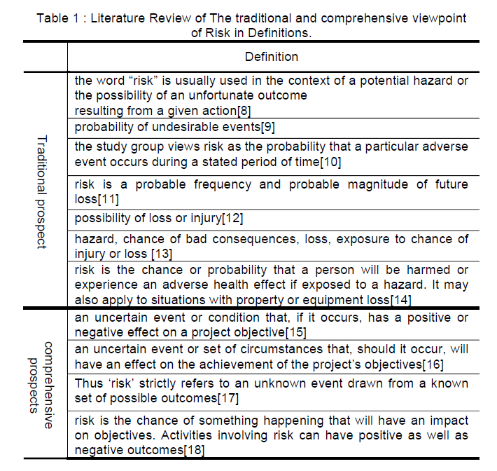 Morphologically the word Risk derived from one of the words “resicum” with Latin root, “rhizikon” with greek root or “risque” with French root within the meanings are in related with threats or avoiding threats. Also a literature review on the traditional concept of the risk clarifies that from the traditional point of view, risk was in liaison with a threat in an uncertain event. However, in the last decades risk implied an event that could produce two or more outcomes and could be defined as a possible loss or gain. Different perspectives are illustrated in (Tab. 1).