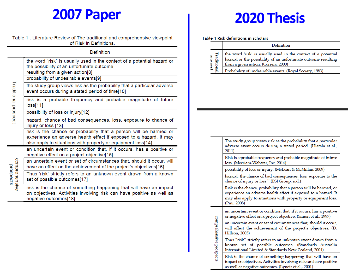 Keeping those incorrect footnotes in place, Dr. Ardebili then used the same paper for his official PhD thesis at the University of Trieste, titled “A method to support risk management and resource allocation in projects based on risk acceptance strategy.” The same incorrect citations appear, copied and pasted, from his 2017 paper into his 2020 PhD dissertation. Instead of footnote numbers, however, they are just presented by the authors’ name or publisher, but they still reference the wrong sources.