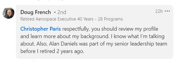 French also just lied about “all the major OEMs” being in agreement and sitting at the table of IAQG and AAQG. Back in 2010 or so, I was with SpaceX and trying to get them a seat at AAQG for this very reason. SpaceX had been winning contracts originally expected to go to Boeing and Lockheed (and their merger, ULA), so it made sense that they should now be represented at AAQG. But another smug OEM representative, Jack Fletcher (retired from NASA), claimed they could attend and “sit in the back with everyone else.” When I pushed back, Fletcher spent the next few years trolling me online, at one point threatening to hit me with a baseball bat. He was very, very angry.