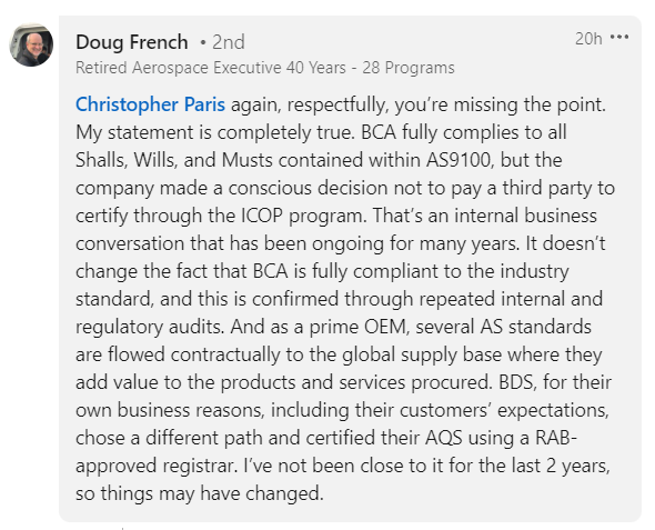 But you, meanwhile, have to suck it up because Boeing not only says so, they run the AS9100 scheme (that they don’t believe in.) And he dug in:
